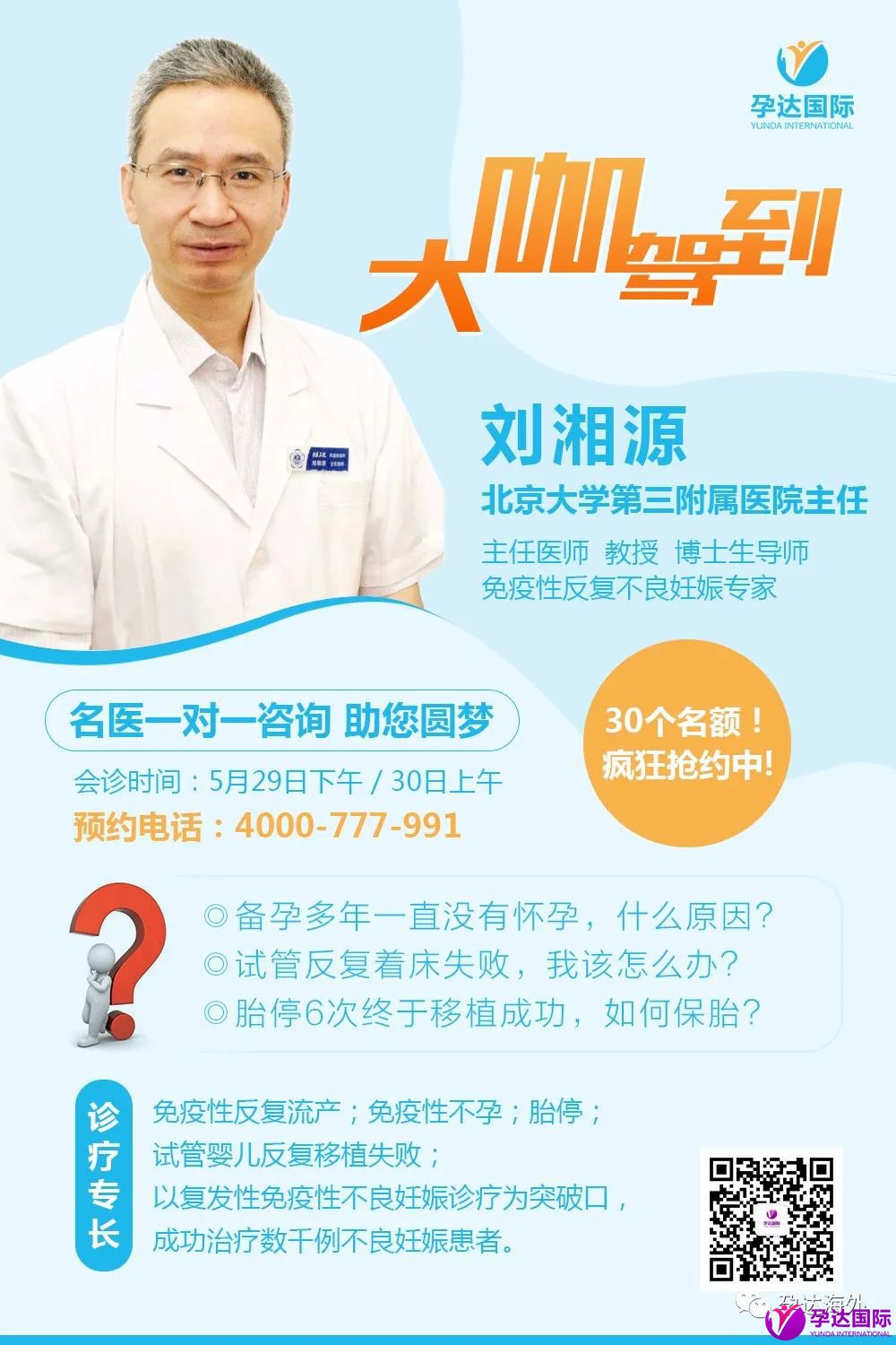 会诊报名方式:准备全套检查项目结果报告,联系孕达国际再行顾问,我们会从报名患者中筛选30名典型的试管婴儿多次移植失败客户,不孕不育患者,多次流产患者进行会诊。
